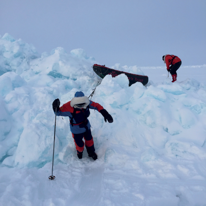 While North and South Poles share the hostility of extreme cold and unpredictable weather, the terrain and challenges are different. The team have made it across the frozen sea of the Arctic Ocean; this expedition will take them close to 10,000 ft above sea level, dragging sledges across rock solid sastrugi with the constant threat of high winds.